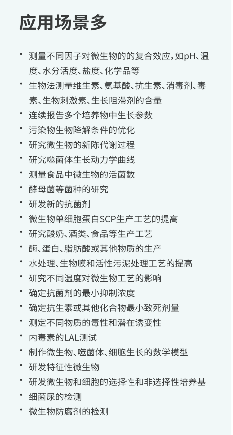 可實(shí)現(xiàn)多種微生物,包括細(xì)菌、真菌、酵母、噬菌體、變形蟲和藻類等的在線監(jiān)測培養(yǎng)。