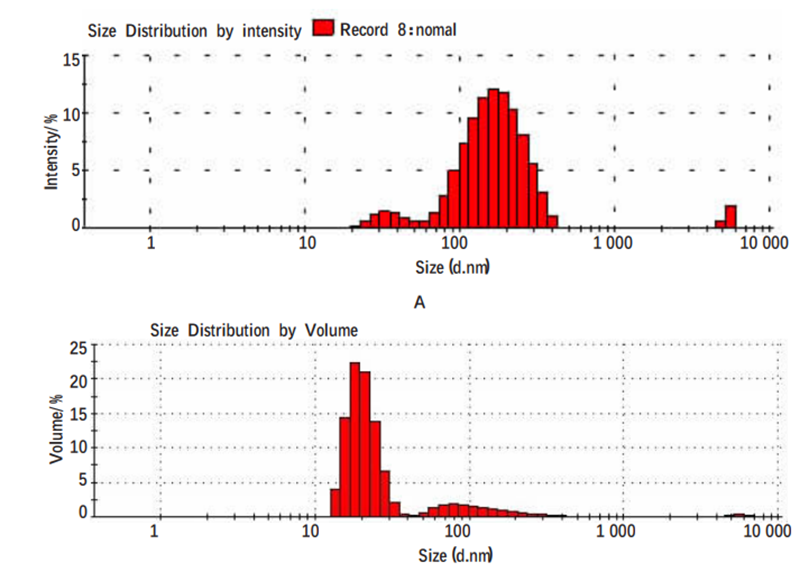 A:超聲前脂質(zhì)體粒徑分布圖;B:超聲20min后脂質(zhì)體粒徑分布圖,輸入功率40%;超聲時間20min;磷脂含量10mmol/L