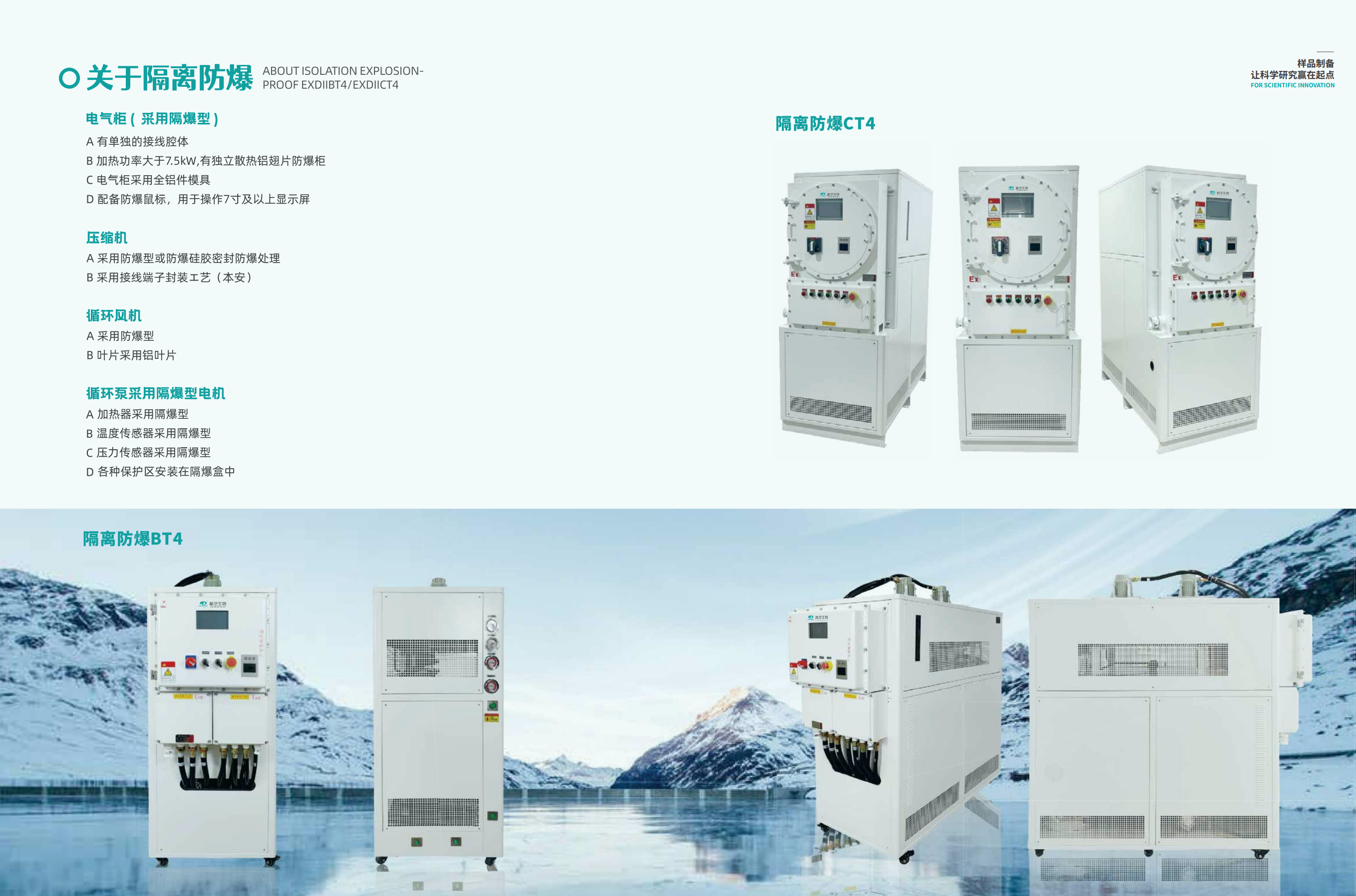 公司產(chǎn)品線涵蓋各種類型的恒溫設(shè)備,包括但不限于:加熱控溫系統(tǒng)50℃~350℃、制冷控溫系統(tǒng)-120℃~30℃、高低溫控溫系統(tǒng)-100℃~300℃。可定制防爆系列:隔離防爆BT4、CT4、正壓防爆。