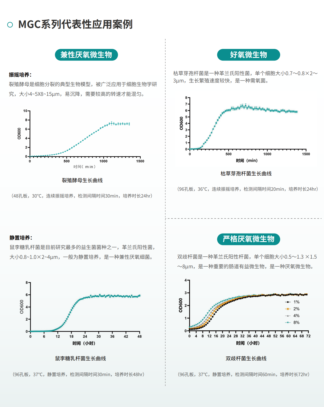 MGC-500微生物生長(zhǎng)曲線(xiàn)分析儀可以實(shí)現(xiàn)不同培養(yǎng)溫度、氣體環(huán)境、振搖狀態(tài)和光照組合下的微生物生長(zhǎng)狀態(tài)實(shí)時(shí)檢測(cè),而且整個(gè)過(guò)程無(wú)需人工頻繁取樣,也無(wú)需人員值守,大大降低了污染風(fēng)險(xiǎn),真正實(shí)現(xiàn)了人力的解放和研究效率的提升。