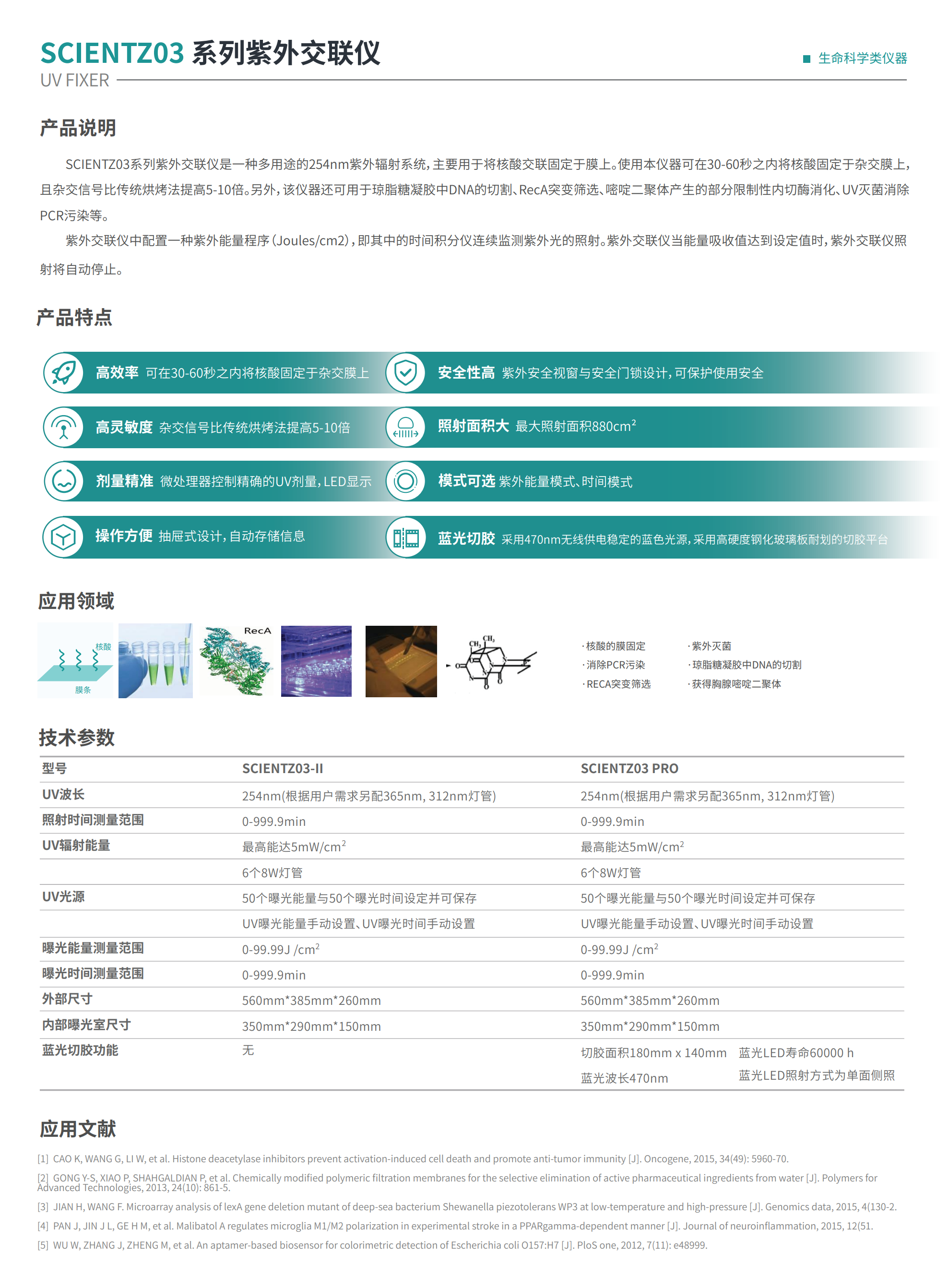新芝生物 SCIENTZ03系列紫外交聯(lián)儀 是一種多用途的254nm紫外輻射系統(tǒng),主要用于將核酸交聯(lián)固定于膜上。使用本儀器可在30-60秒之內(nèi)將核酸固定于雜交膜上, 且雜交信號(hào)比傳統(tǒng)烘烤法提高5-10倍。另外,該儀器還可用于瓊脂糖凝膠中DNA的切割、RecA突變篩選、嘧啶二聚體產(chǎn)生的部分限制性內(nèi)切酶消化、UV滅菌消除PCR污染等。紫外交聯(lián)儀中配置一種紫外能量程序(Joules/cm2),即其中的時(shí)間積分儀連續(xù)監(jiān)測(cè)紫外光的照射。紫外交聯(lián)儀當(dāng)能量吸收值達(dá)到設(shè)定值時(shí),紫外交聯(lián)儀照射將自動(dòng)停止。