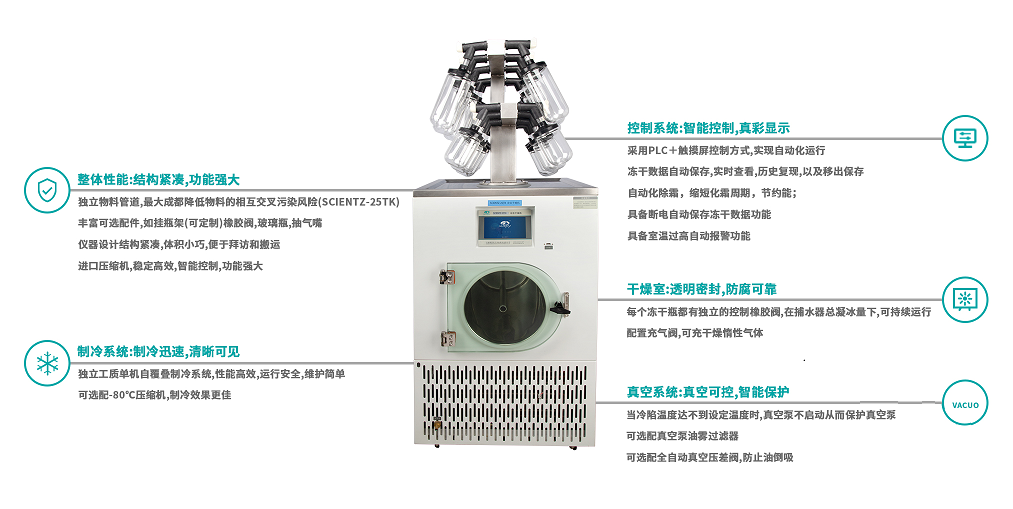 ? 整體性能:結(jié)構(gòu)緊湊,功能強(qiáng)大 · 獨(dú)立物料管道,最大程度降低物料的相互交叉污染風(fēng)險(xiǎn)(SCIENTZ-25TK) · 豐富可選配件,如掛瓶架(可定制)橡膠閥,玻璃瓶,抽氣嘴 · 儀器設(shè)計(jì)結(jié)構(gòu)緊湊,體積小巧,便于拜訪和搬運(yùn) · 進(jìn)口壓縮機(jī),穩(wěn)定高效,智能控制,功能強(qiáng)大 | ? 真空系統(tǒng):真空可控,智能保護(hù) · 當(dāng)冷阱溫度達(dá)不到設(shè)定溫度時(shí),真空泵不啟動(dòng),而保護(hù)真空泵 · 可選配真空泵油霧過濾器 · 可選配全自動(dòng)真空壓差閥,防止油倒吸 |