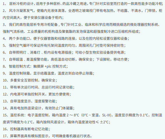 層析實驗冷柜又叫層析冷柜、數(shù)控層析冷柜、層析柜、恒溫層析柜。層析實驗冷柜是專為生化層析實 驗而研制的特殊用途低溫柜,也可用于其他需要低溫環(huán)境的實驗,或用于物品冷藏,經(jīng)過科學設計,冷柜總高度不超過2米,便于進出房間和電梯;而柜內空間高大,可輕松操作。