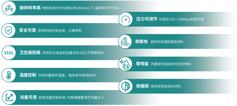 物料由物料杯經(jīng)單向閥進入高壓倉,通過泵體伸縮加壓使樣品達到所調(diào)節(jié)控制的高壓下,通過特定寬度的限流縫隙瞬間釋放形成微射流撞擊沖擊閥或均質(zhì)閥上,依次經(jīng)過空穴、撞擊、剪切的作用來達到物料的乳化分散和細胞粉碎機的目的。