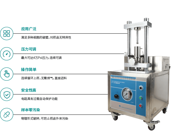 ? 應(yīng)用廣泛 滿(mǎn)足多種細(xì)胞的破壁,對(duì)樣品無(wú)特異性 | ? 壓力可調(diào) 最大可達(dá)40000 PSI壓力,連續(xù)可調(diào) |